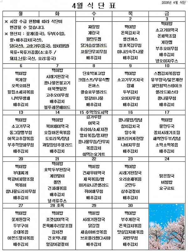 2026년 4월 식단표 ^^ 페이지 정보 작성자 관리자 작성일26-03-31 16:13 조회149회 댓글0건 이전글 다음글 목록 본문 꽃이 완연하게 피는 따뜻한 4월입니다. ^^ 좋은 재료로 만든 맛있는 음식을 잘 먹고 건강하게 생활하겠습니다. 이전글 다음글 목록