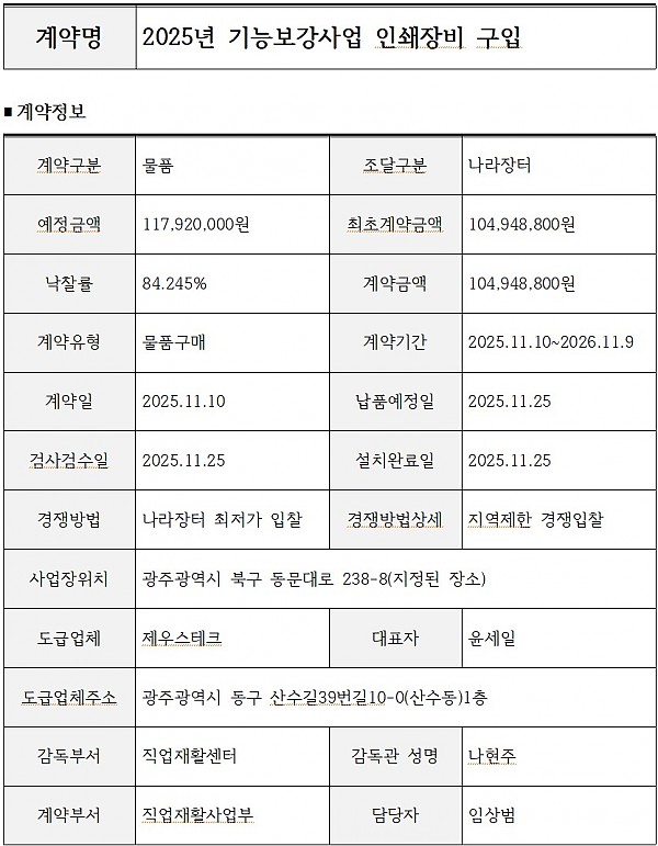 2025년 기능보강사업 인쇄장비 구입 업체 계약 정보공개 페이지 정보 작성자 관리자 작성일25-11-26 11:01 조회178회 댓글0건 이전글 다음글 목록 본문 2025년 기능보강사업 인쇄장비 구입 업체 계약 정보공개 이전글 다음글 목록