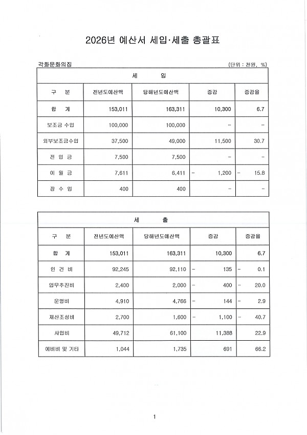 2. 공고사항 : 2026 각화문화의집 세입·세출 예산서